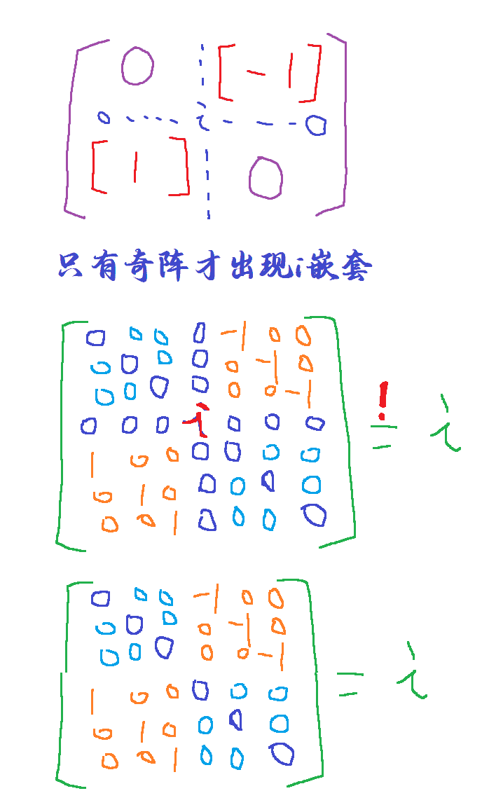 内容预览:…… 前面说虚数是个矩阵穿越者,所以必定会在各级矩阵中同时出现,是无限嵌套的存在,但到底如何嵌套存在,我闭门造车的这么一想,觉得i必定出现在虚数单位矩阵之中,但上次说副对角线上全都是i显然不正确,而下面这样就非常靠谱了。但显然的只有在奇数行列的矩阵里才会出现i,偶数矩阵根本就不需要这个“核心”位置的i的出现,只要两个正负 …………